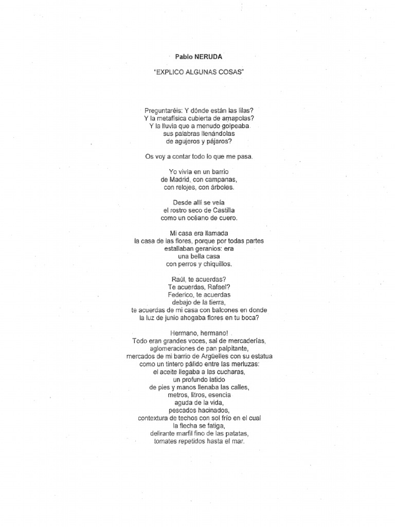 Explico Algunas Cosas Pablo Neruda : Este poema es sacado del libro españa en el corazón que el poeta escribió en una crisis provocada por el horror de la guerra civil española.